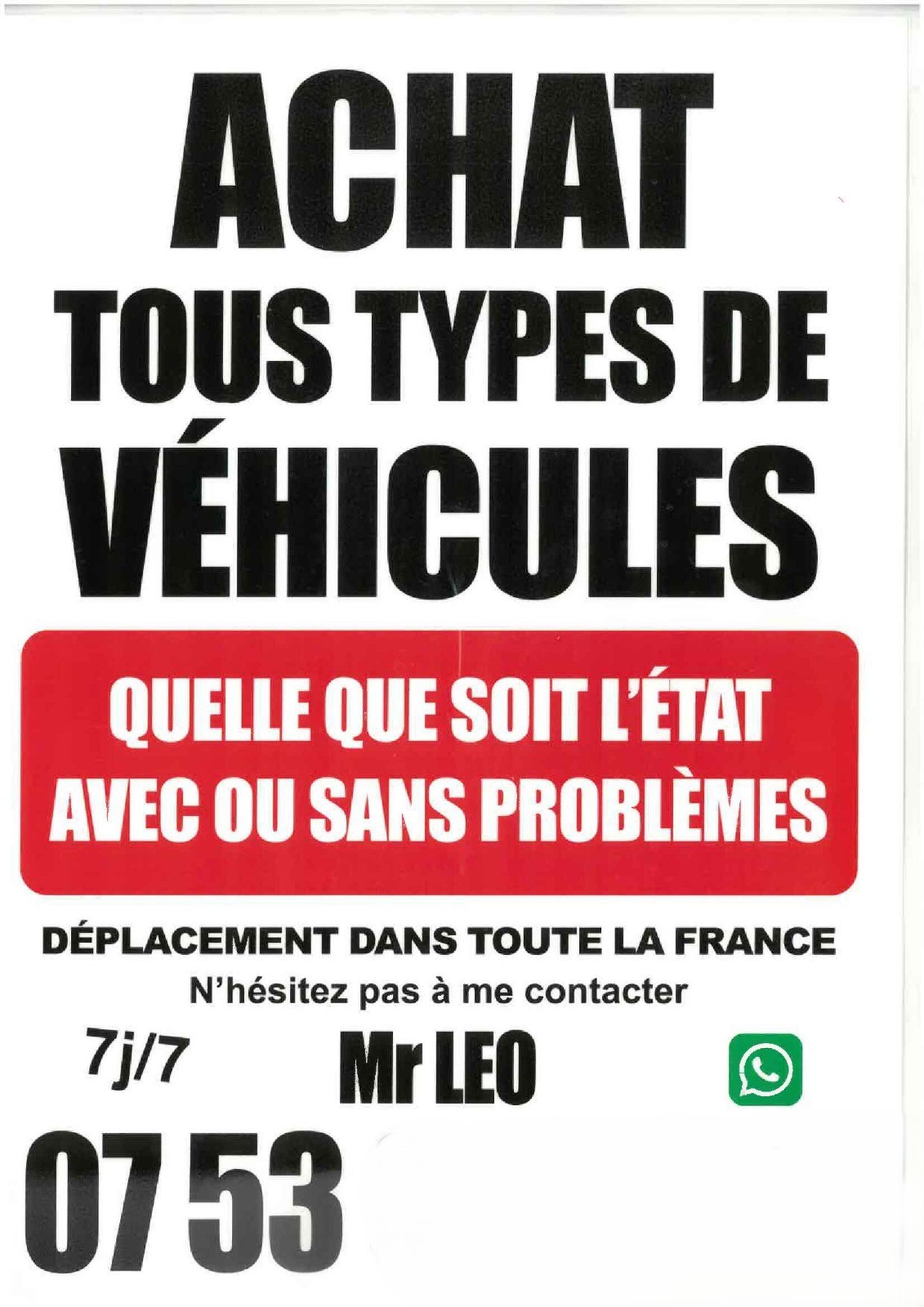Photographie d'une affiche d'affichage sauvage, imprimée sur papier A4 blanc, collée sur un poteau. Le texte en gras et en noir en haut indique "ACHAT TOUS TYPES DE VÉHICULES". Au centre, un bandeau rouge vif contient le texte en blanc "QUELLE QUE SOIT L'ÉTAT AVEC OU SANS PROBLÈMES". En dessous, le texte précise "DÉPLACEMENT DANS TOUTE LA FRANCE" et "N'hésitez pas à me contacter". Le bas de l'affiche mentionne "Mr LEO", la disponibilité "7j/7", et le début d'un numéro de téléphone "07 53", le reste étant flouté. Un logo WhatsApp vert est visible. L'ensemble présente les caractéristiques typiques d'une offre non réglementée.
