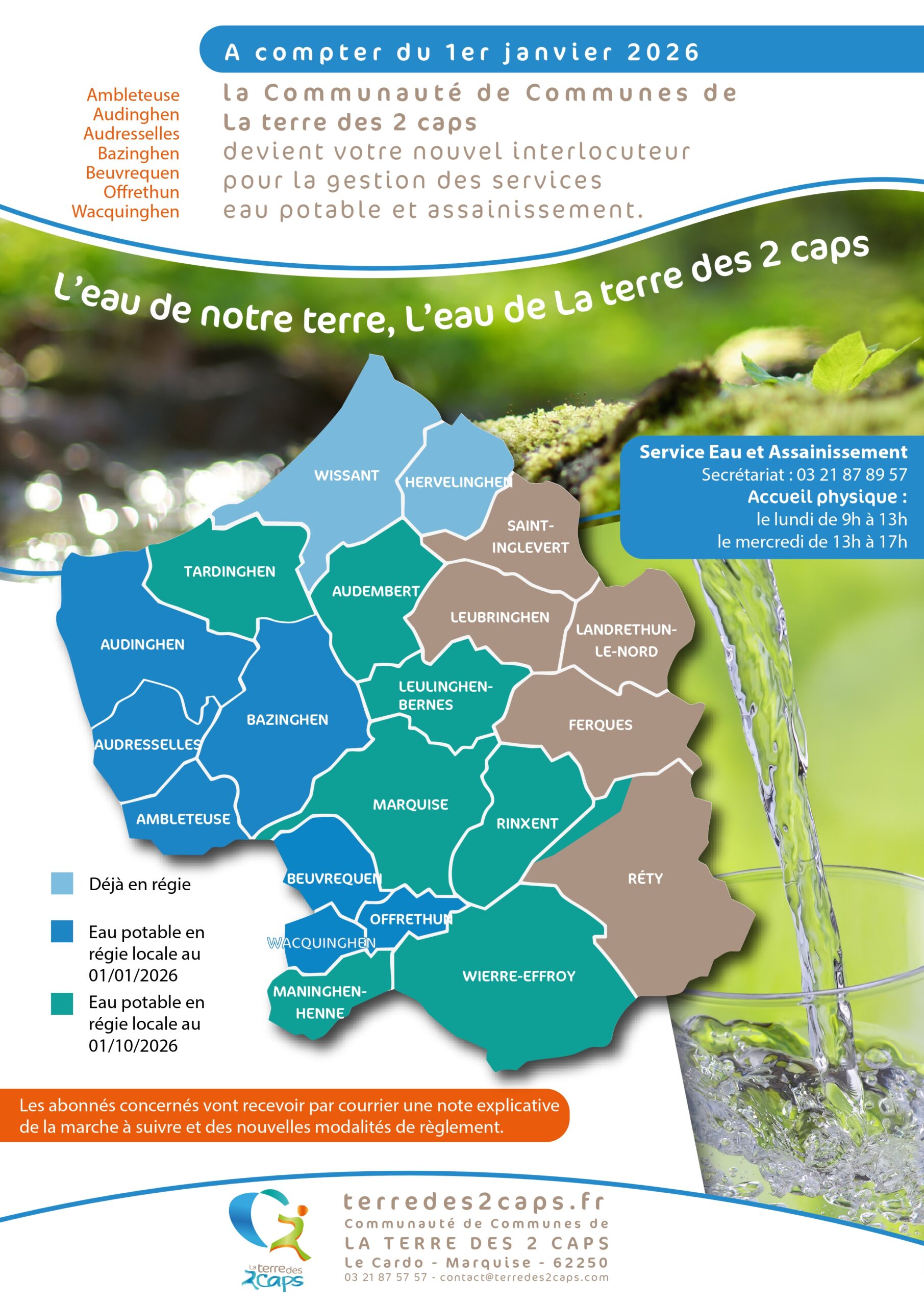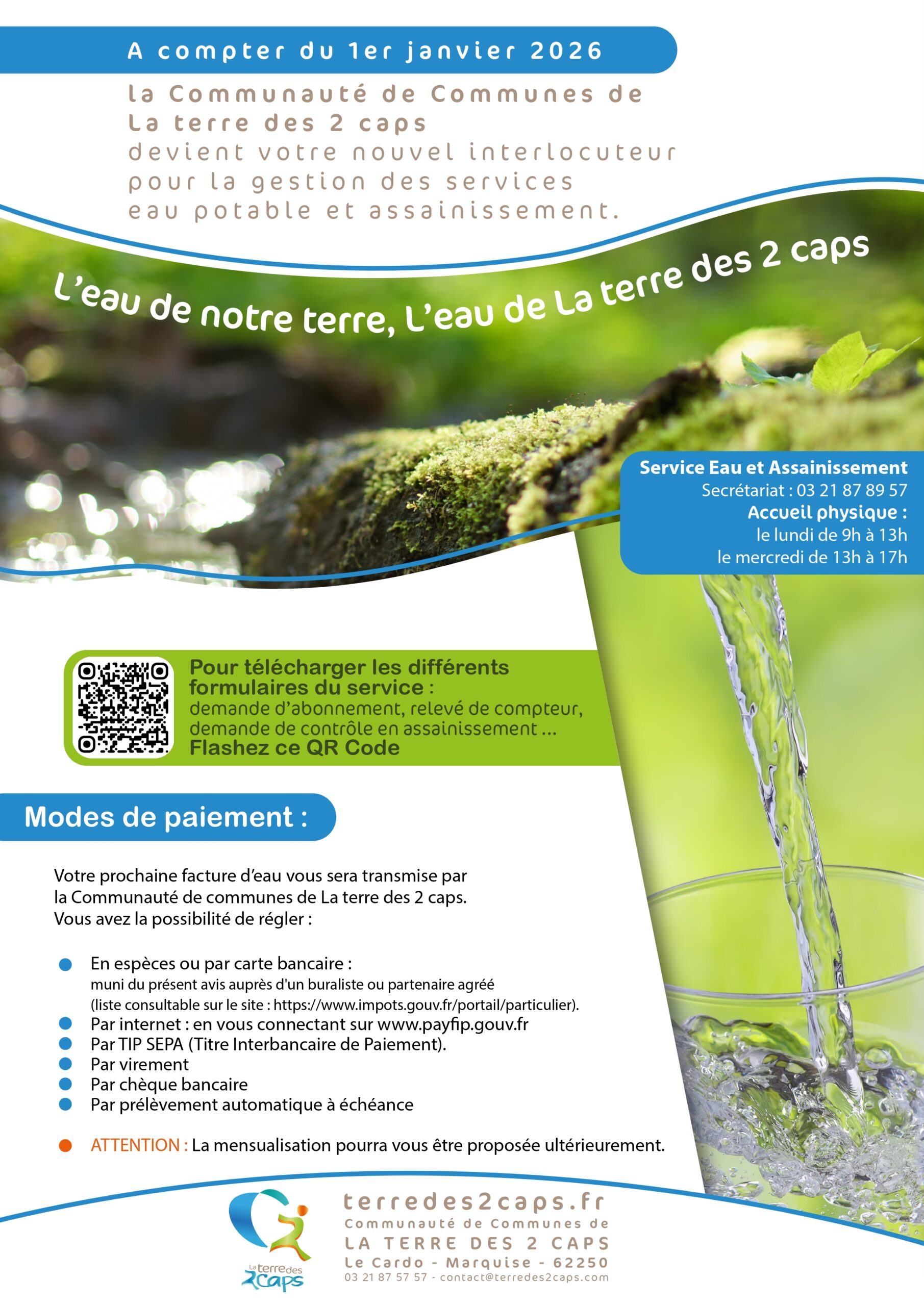 Description du flyer : Transition vers la régie de l'eau (La Terre des 2 Caps) Ce document d'information annonce un changement dans la gestion de l'eau potable et de l'assainissement pour plusieurs communes du territoire de La Terre des 2 Caps. Informations clés sur le changement de gestion Date d'effet : À compter du 1er janvier 2026. Nouvel interlocuteur : La Communauté de Communes de La Terre des 2 Caps assure désormais la gestion des services d'eau et d'assainissement pour les communes concernées. Communes basculant au 01/01/2026 : Ambleteuse, Audinghen, Audresselles, Bazinghen, Beuvrequen, Offrethun et Wacquinghen. État de la gestion par commune (Carte) Le flyer présente une carte du territoire classée par zones de gestion : Déjà en régie : Wissant, Hervelinghen, Tardinghen, Audembert, Saint-Inglevert, Leubringhen, Landrethun-le-Nord, Leulinghen-Bernes, Ferques, Marquise, Rinxent, Wierre-Effroy et Réty. Eau potable en régie locale au 01/01/2026 : Audinghen, Audresselles, Ambleteuse, Bazinghen, Beuvrequen, Offrethun et Wacquinghen. Eau potable en régie locale au 01/10/2026 : Maninghen-Henne. Contact et modalités Service Eau et Assainissement : Secrétariat : 03 21 87 89 57. Accueil physique : Le lundi de 9h à 13h et le mercredi de 13h à 17h. Accompagnement : Les abonnés concernés recevront un courrier postal détaillant la marche à suivre et les nouvelles modalités de paiement. Coordonnées générales : Communauté de Communes de LA TERRE DES 2 CAPS, Le Cardo, 62250 Marquise. Téléphone : 03 21 87 57 57. Site web : terredes2caps.fr.Annonce du changement de gestionnaire (Flyer avec carte) Ce visuel informe les habitants d'un changement dans la gestion des services d'eau potable et d'assainissement. Informations principales Nouvel interlocuteur : La Communauté de Communes de La Terre des 2 Caps. Date d'entrée en vigueur : À compter du 1er janvier 2026. Communes concernées par ce basculement : Ambleteuse, Audinghen, Audresselles, Bazinghen, Beuvrequen, Offrethun et Wacquinghen. Accompagnement : Les abonnés recevront un courrier postal détaillant la marche à suivre et les nouvelles modalités de paiement. Organisation territoriale (Carte) La carte illustre trois situations différentes sur le territoire: Déjà en régie : Wissant, Hervelinghen, Saint-Inglevert, Audembert, Leubringhen, Landrethun-le-Nord, Leulinghen-Bernes, Ferques, Marquise, Rinxent, Réty, Wierre-Effroy. En régie au 01/01/2026 : Audinghen, Audresselles, Ambleteuse, Bazinghen, Beuvrequen, Offrethun, Wacquinghen. En régie au 01/10/2026 : Maninghen-Henne. Contact du Service Eau et Assainissement Secrétariat : 03 21 87 89 57. Accueil physique : Le lundi (9h-13h) et le mercredi (13h-17h). Siège : Le Cardo, Marquise (03 21 87 57 57). Document 2 : Modalités pratiques et paiement (Flyer avec QR Code) Ce second volet détaille les démarches administratives et les moyens de règlement. Démarches en ligne Un QR Code permet de télécharger les formulaires suivants : demande d'abonnement, relevé de compteur, ou demande de contrôle d'assainissement. Modes de paiement acceptés Les usagers pourront régler leur facture par plusieurs moyens: Paiement de proximité : En espèces ou carte bancaire chez un buraliste partenaire (avec l'avis de facture). En ligne : Via le site www.payfip.gouv.fr. Autres moyens : TIP SEPA, virement, chèque bancaire ou prélèvement automatique à échéance. Note importante : La mensualisation n'est pas disponible immédiatement mais pourra être proposée ultérieurement.