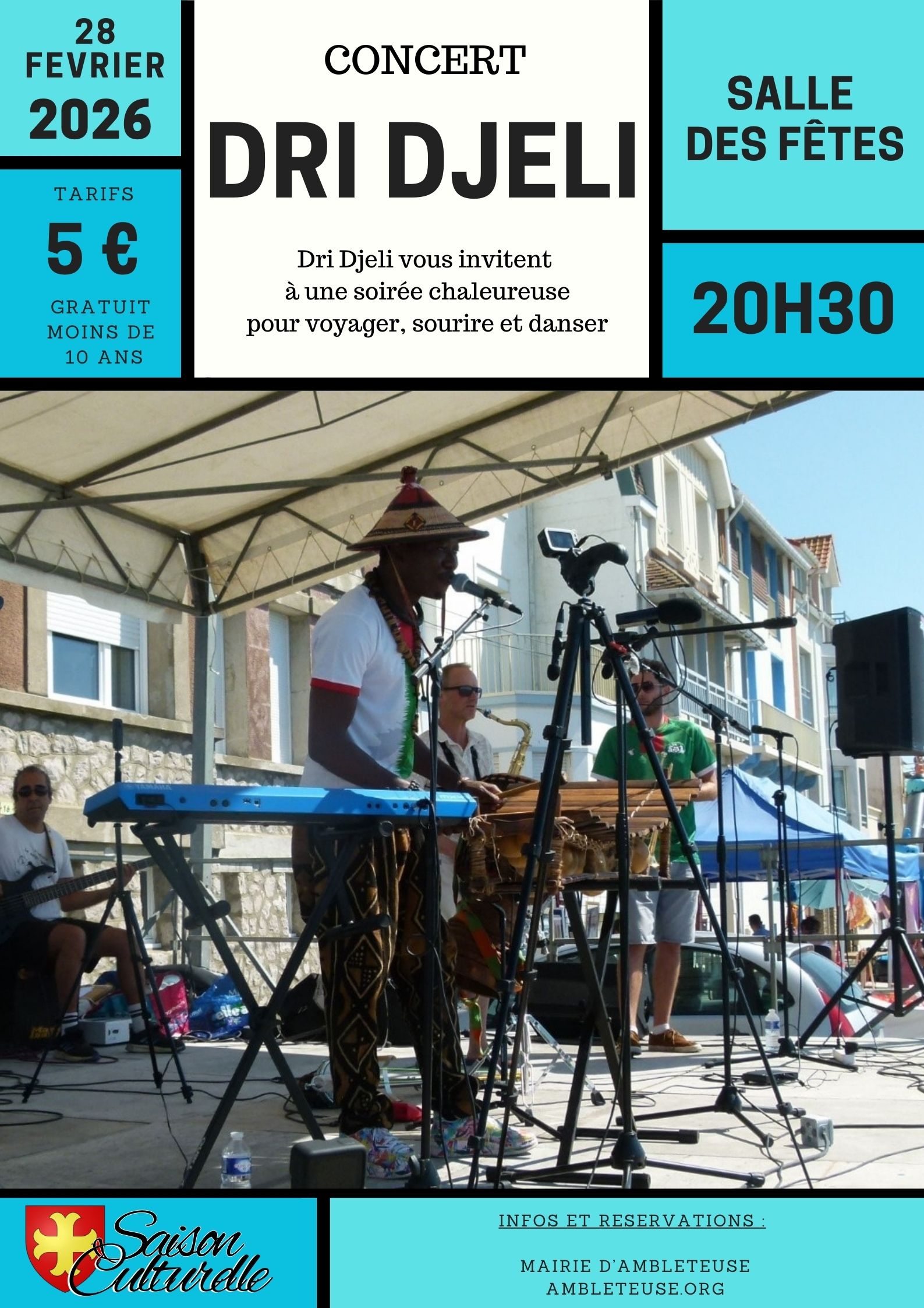 🎶 Concert – Dri Djeli 🎶📅 Vendredi 28 février 2026📍 Salle des fêtes d’Ambleteuse🕣 20h30 Le groupe Dri Djeli sera en concert à Ambleteuse pour un voyage musical mêlant musiques africaines, rythmes modernes et sonorités du monde.Leur univers se distingue par l’alliance d’instruments traditionnels (balafon, ... Lire La Suite…