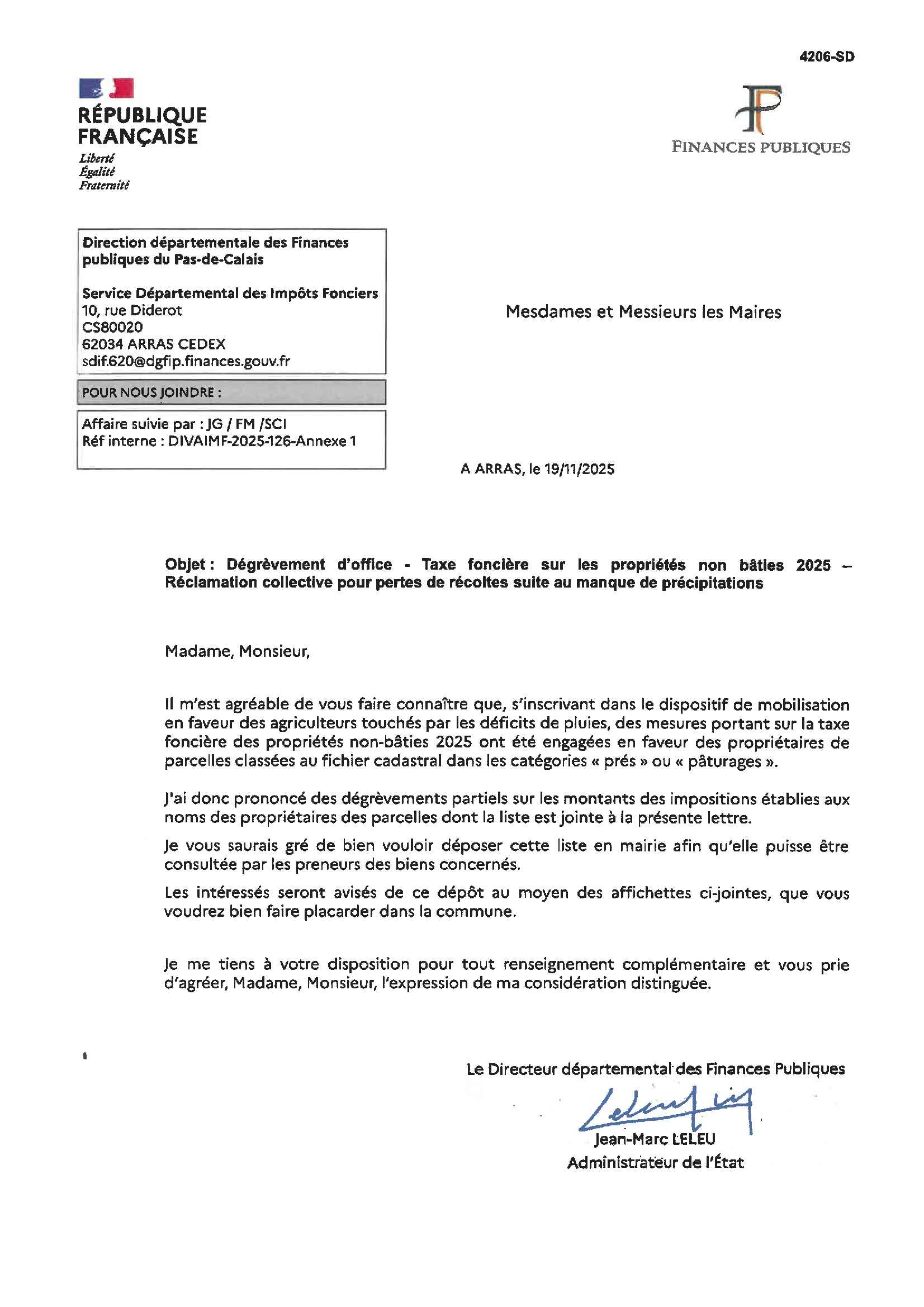 Avis officiel de la Mairie d'Ambleteuse concernant le dégrèvement d'impôts directs 2025 pour pertes de récoltes suite à la sécheresse Affiche officielle des Finances Publiques et de la Mairie d'Ambleteuse datée du 10 décembre 2025. Elle informe les contribuables que la liste des parcelles bénéficiant d'un dégrèvement d'impôts suite au manque de précipitations est consultable en mairie.
