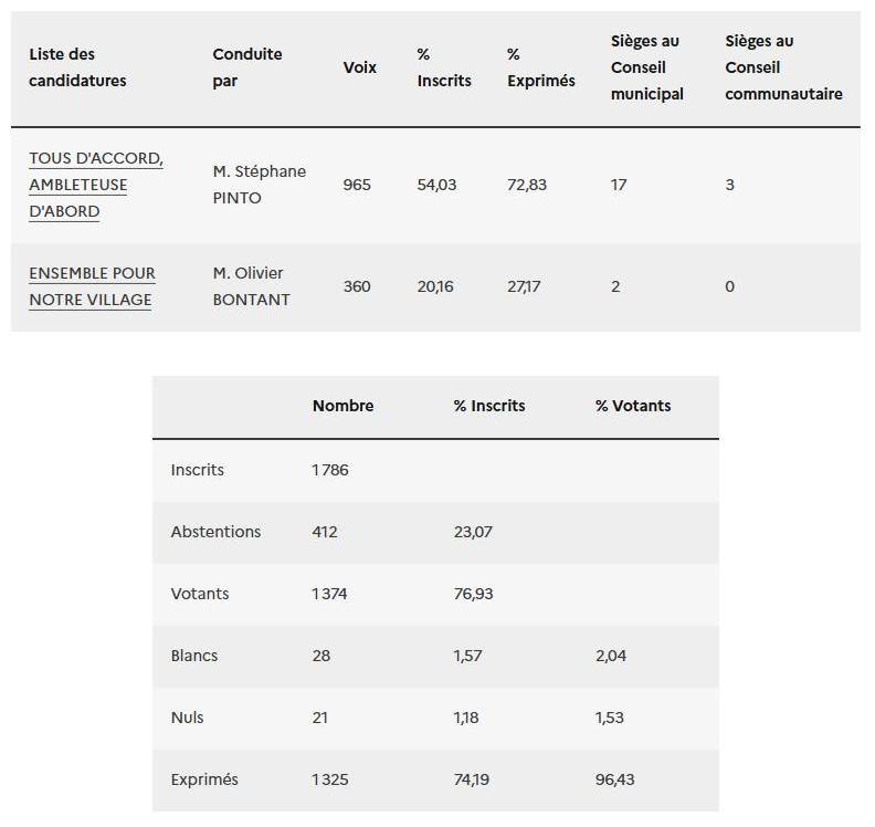 La liste conduite par M. Stéphane PINTO ayant obtenu la majorité absolue, le nouveau Conseil municipal est intégralement élu dès ce premier tour.